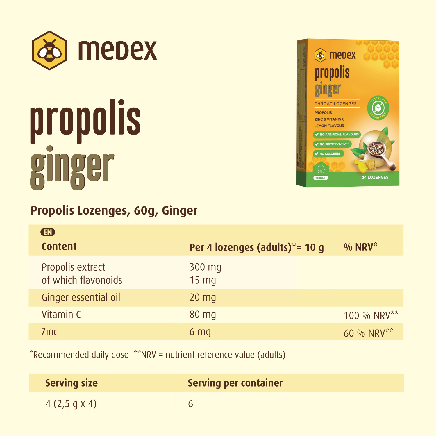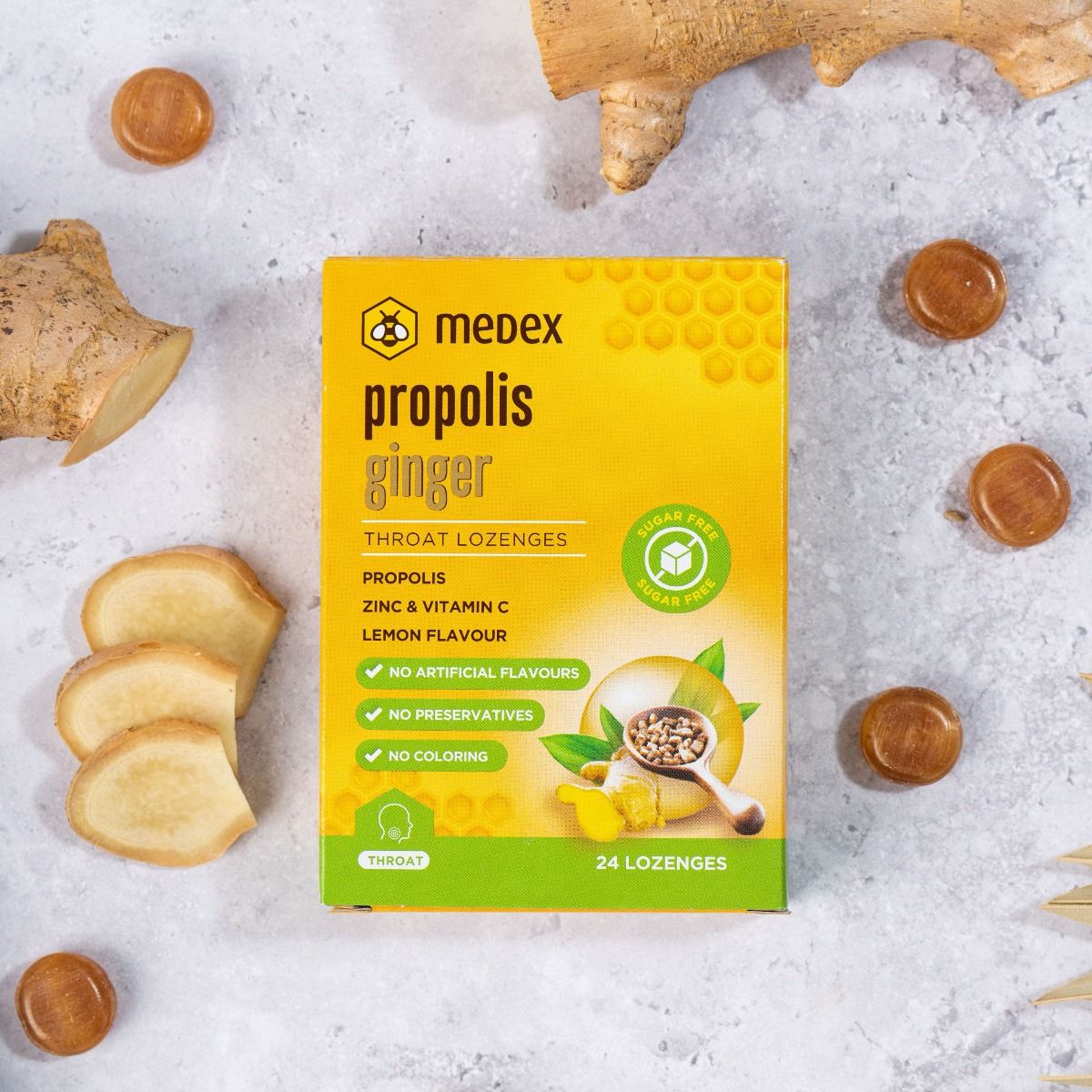 sweetener: isomalt, powdered propolis extract (dextrin, anti-caking agent:silicon dioxide), vitamin C (L-ascorbic acid), acidity regulator: citric acid, natural lemon flavouring with other natural flavourings, zinc citrate, ginger extract (Zingiber officinale), natural ginger flavouring, natural flavouring, sweetener: steviol glycosides, menthol.