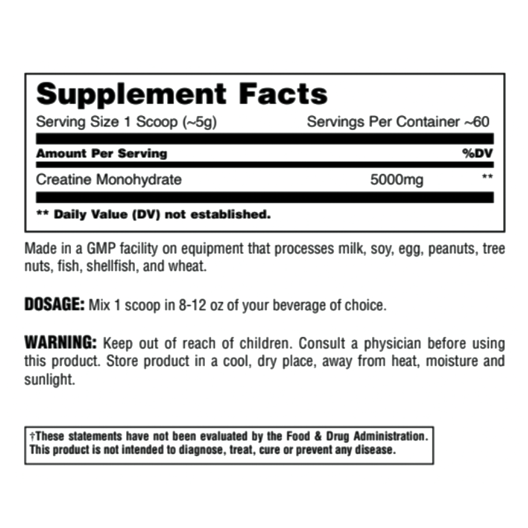 - Pure Micronized Creatine Monohydrate: Contains 100% pure creatine monohydrate with no fillers or additives.